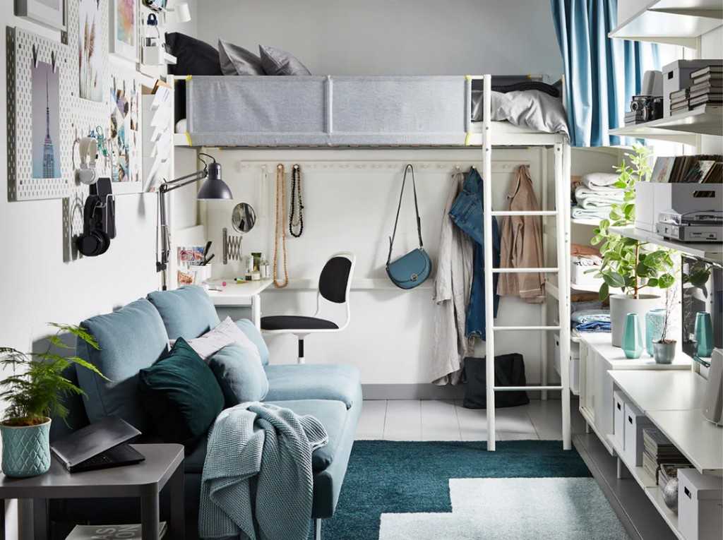 Эти варианты продаются только с одним каркасом. Чтобы обустроить место под дном кровати, необходимо докупать другую мебель. Здесь можно поставить небольшой диванчик (например, серии «Бединге»), рабочий стол с компьютером или ноутбуком, стеллаж с книгами, кресло-мешок, игровой манеж, гардероб и др.