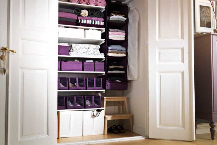 Рекомендуется, также, использовать прозрачные контейнеры-сетки и пластиковые полуматовые ящики, сквозь стенки которых будут видны цвета свитеров и футболок. Кроме того, советуем не загромождать нижнее пространство гардеробной или шкафа, а переместить вещи на верхние полки, чтобы можно было вплотную подойти к полкам.