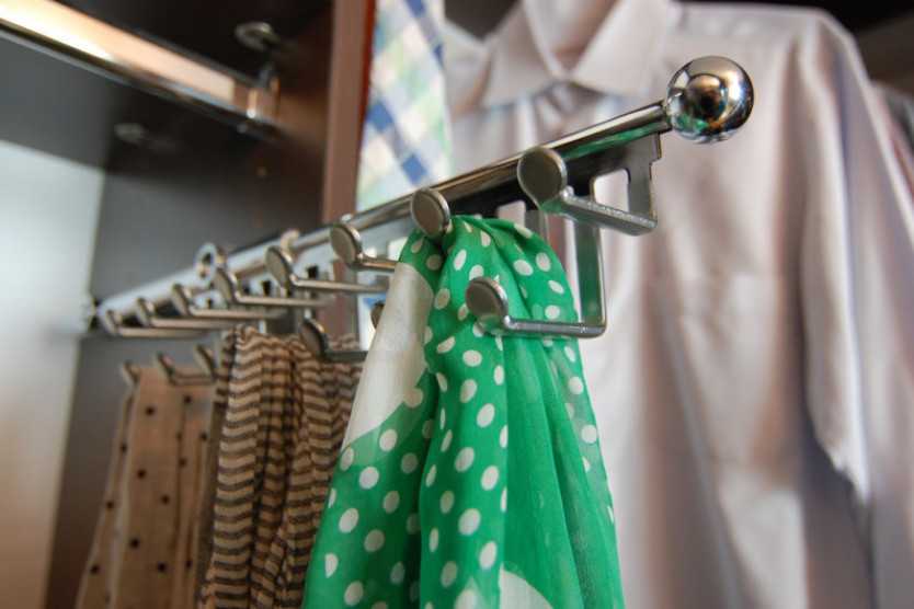 Организовать хранение аксессуаров помогут выдвижные ящики с отсеками для белья, галстуков или ремней; также, рекомендуем прикрепить несколько крючков или специальный держатель для шарфов к стене или двери шкафа, а вот для больших и маленьких сумок лучше отвести отдельную стационарную полку.