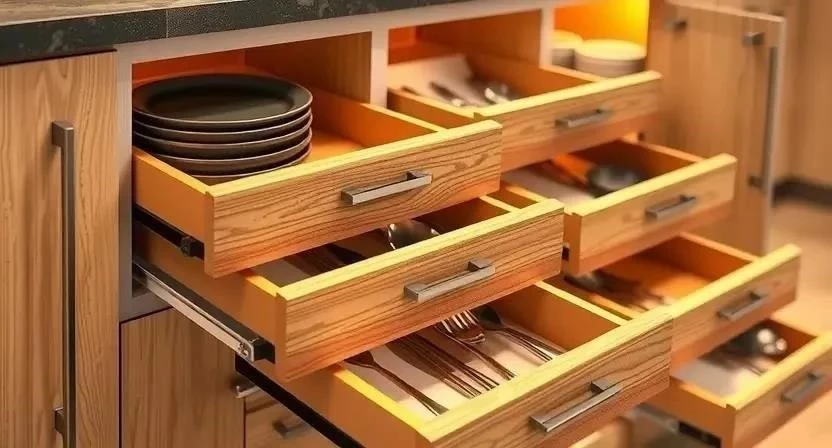 Шкафы с выдвижными ящиками на кухне обеспечивают удобное хранение посуды, столовых приборов и кухонной утвари. Угловые решения позволяют максимально использовать пространство в углу кухни. Я очень доволен своим кухонным шкафом с выдвижными ящиками, он значительно облегчил мне жизнь.