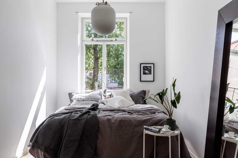 Обычно в стандартных спальнях небольшого метража имеется одно окно. В этом случае лучше всего придвинуть кровать изголовьем к стене, которая располагается перпендикулярно оконному проёму. С обеих сторон от постели нужно оставить равные по размеру проходы.