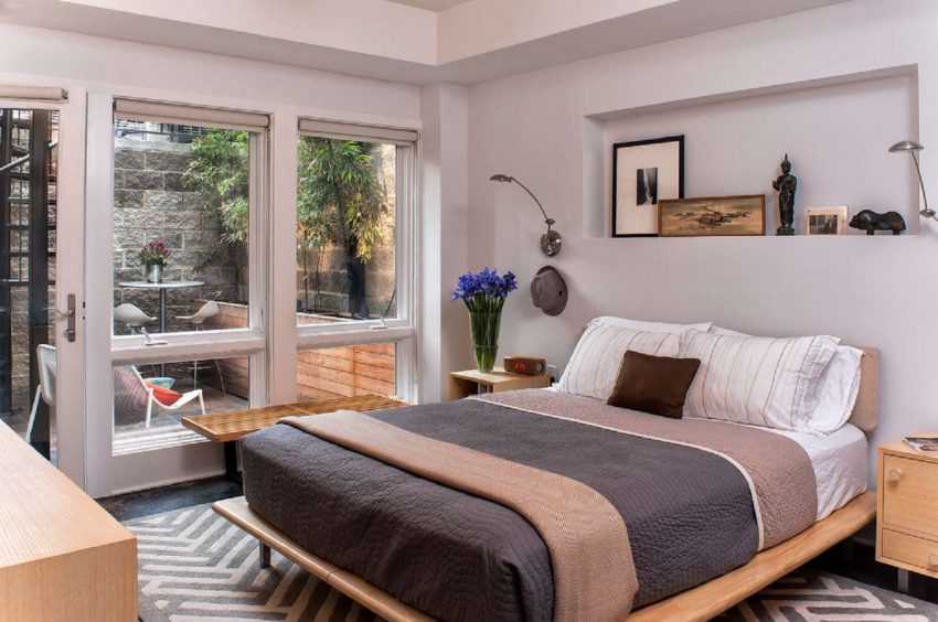 - Монтаж ниши. Если планировка комнаты предусматривает нишу (или вы возвели её самостоятельно), то это будет просто отличным вариантом для тех, кто совмещает, например, спальню и гостиную в одной комнате. Укромный уголок позволит не только индивидуализировать пространство для отдыха, но ещё и визуально сделает комнату более правильной формы. Однако есть у этого варианта и минус – кровать будет окружена стенами с трёх сторон, а значит, проход к ней остаётся только один.
