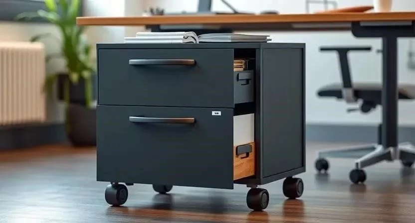 Ответ: Для небольшого офиса лучше выбрать узкий комод на колесах или подвесной комод.