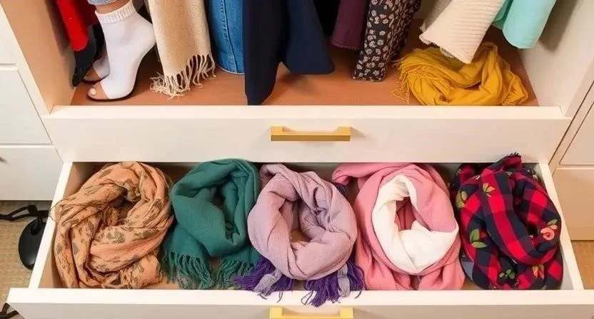- Вертикальное хранение: шарфы и платки складываются вертикально, как книги.