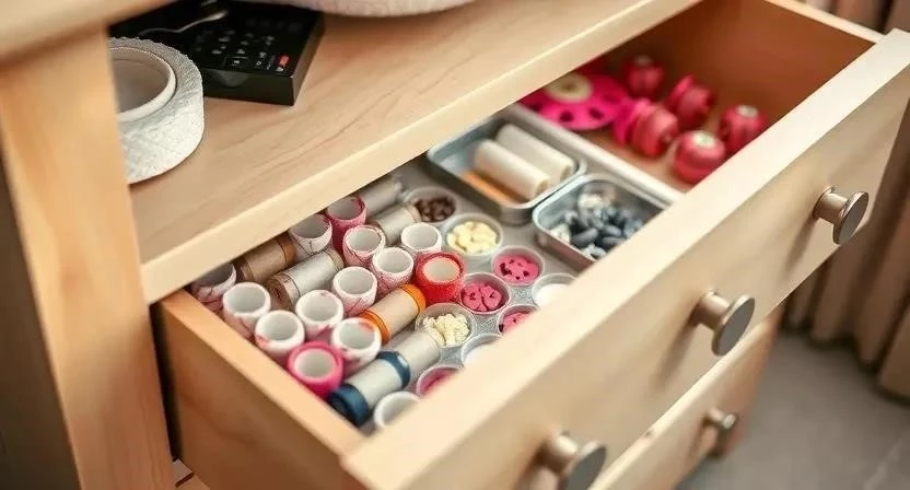 Чтобы максимально эффективно использовать пространство в ящиках комода, используйте разделители, контейнеры и органайзеры. Разделители помогут разделить ящик на секции для хранения разных видов материалов. Контейнеры и органайзеры идеально подходят для хранения мелких предметов, таких как нитки, иголки и пуговицы. Я думаю, что это очень удобно, когда все разложено по своим местам. Я однажды потратил полчаса, чтобы найти нужные нитки, потому что все было в беспорядке.