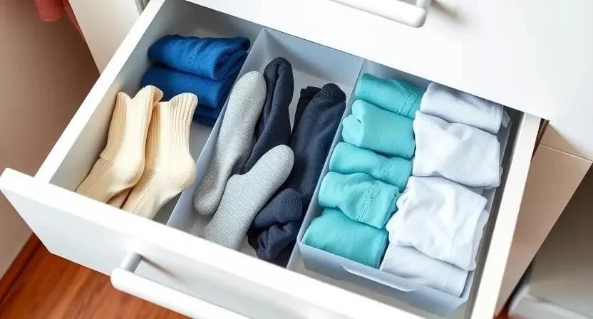Организация хранения нижнего белья и носков – это целое искусство. Я рекомендую использовать тканевые органайзеры с ячейками, чтобы каждый предмет имел свое место. Можно также использовать метод скручивания носков, чтобы они занимали меньше места. Регулярно перебирайте белье и носки, избавляясь от изношенных вещей.