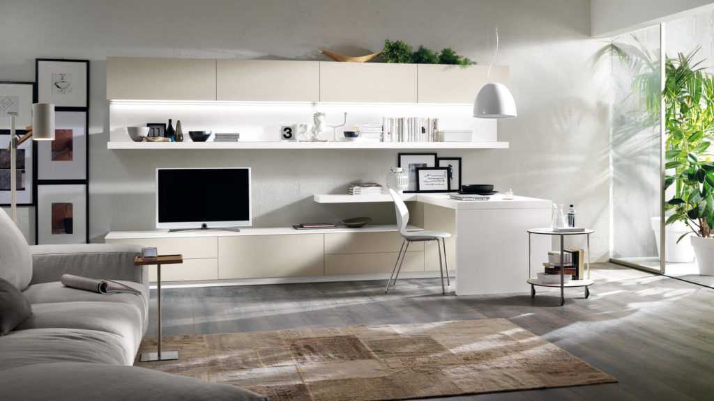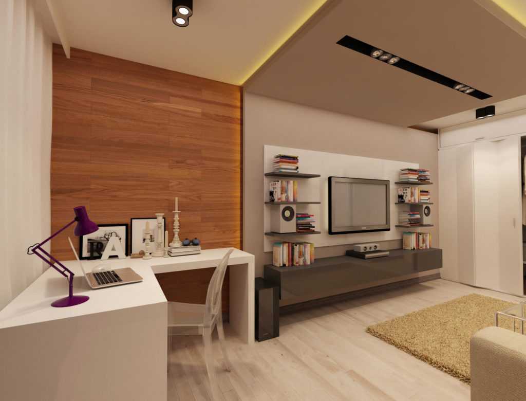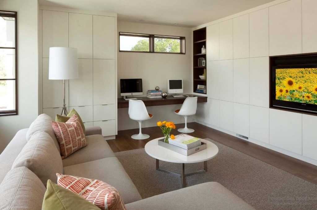 Неплохой вариант — откидная столешница, которая в обычное время является дверцей. По окончании работы достаточно вернуть ее на прежнее место и гостиная примет свой обычный вид.