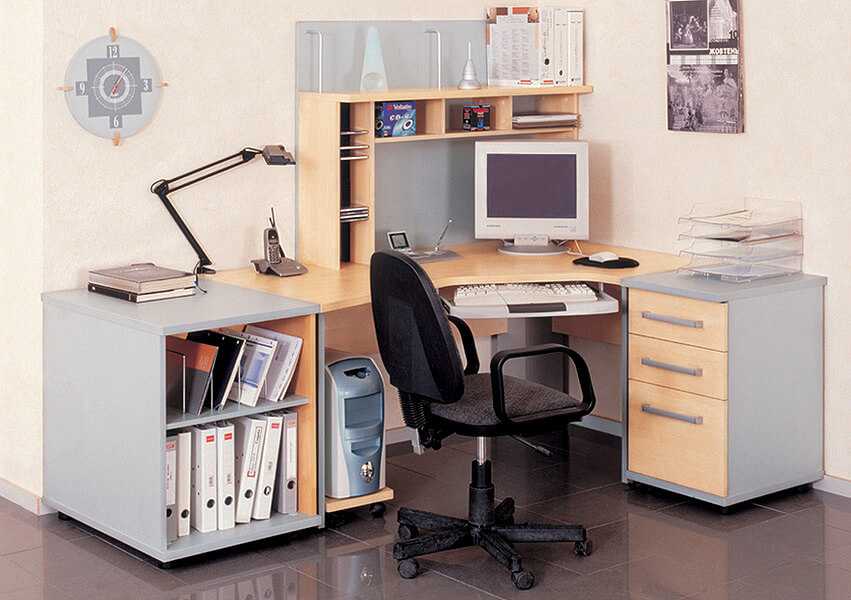 - Поскольку надстройка, шкафы, полки, стеллажи и МФУ находятся на расстоянии вытянутой руки – увеличивается комфортность эксплуатации компьютерного стола.
