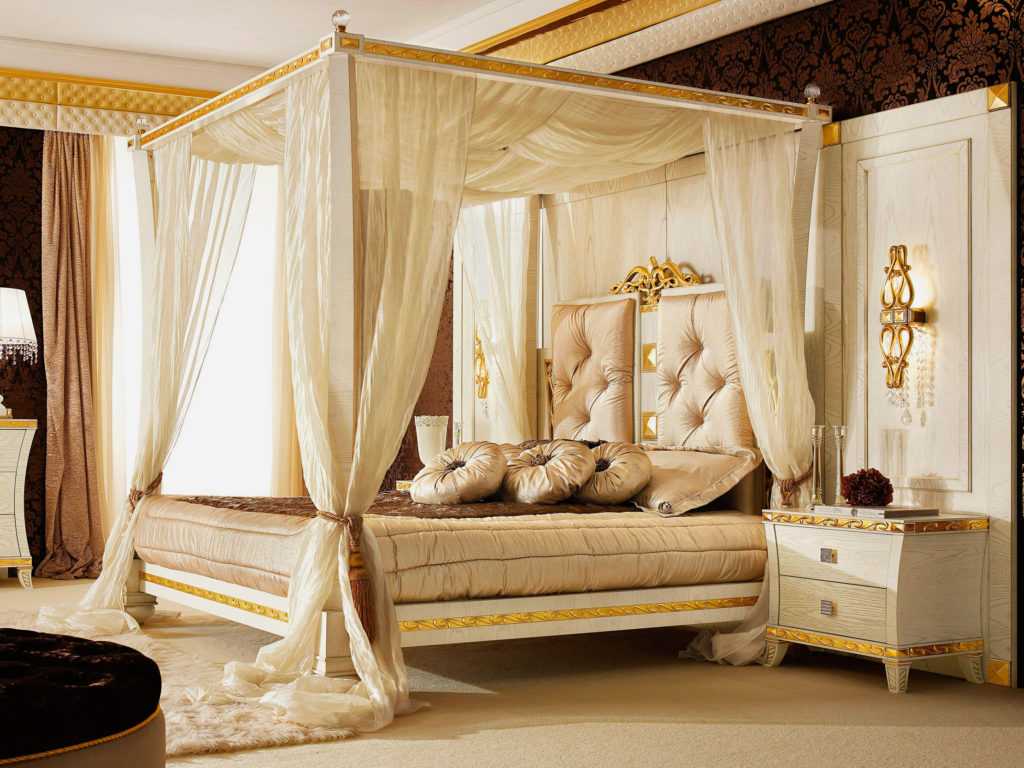 Поскольку выбор форм, размеров, ткани и украшений для балдахинов позволяет создавать разные, непохожие одна на другую конструкции, царское ложе можно органично вписать в большинство известных на сегодняшний день интерьеров: