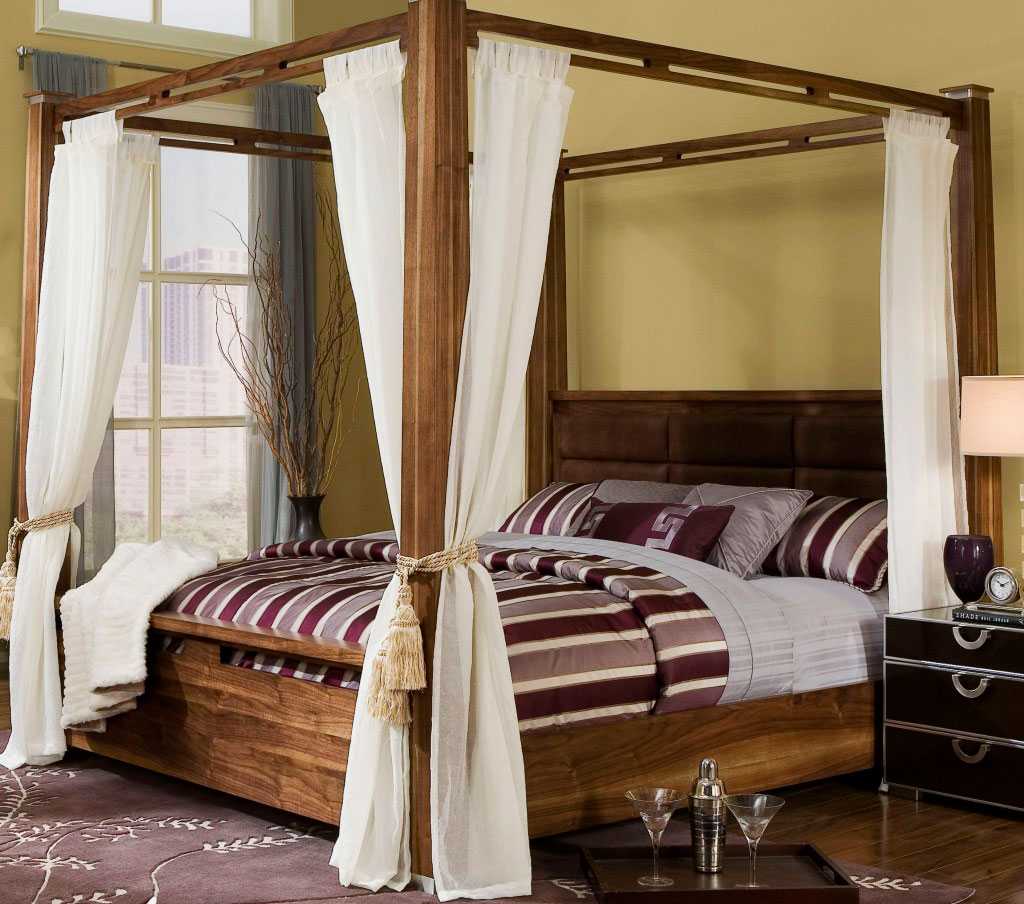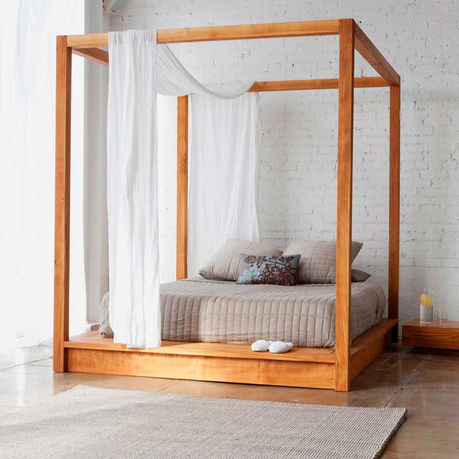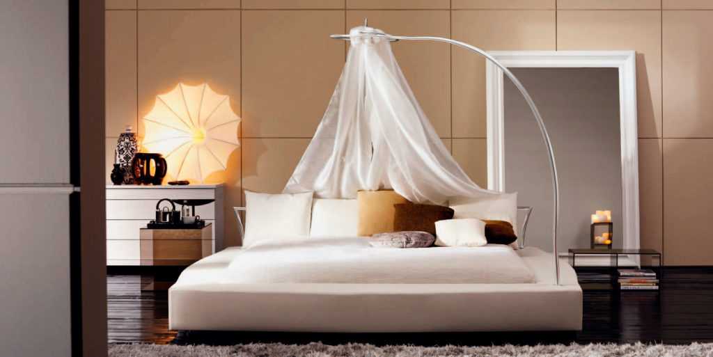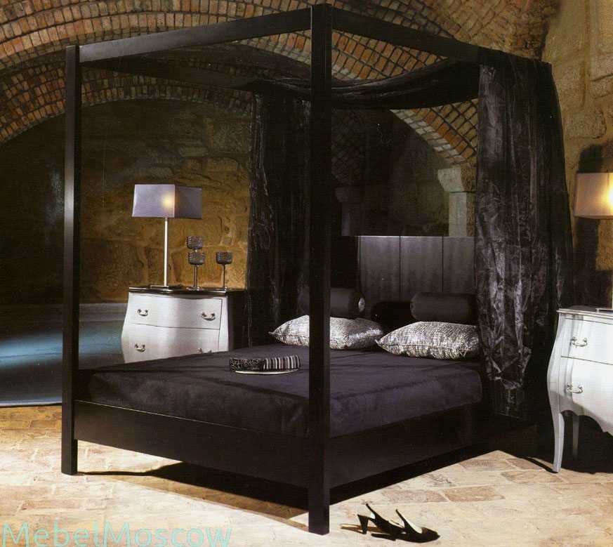 Многие современные стилизованные интерьеры включают в себя кровать с балдахином или навесом. Как правило, кровать размещается на подиуме строгой геометрии, изготовленном из дерева или металла.
