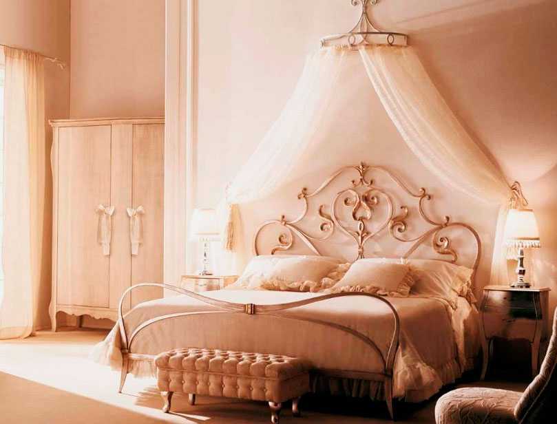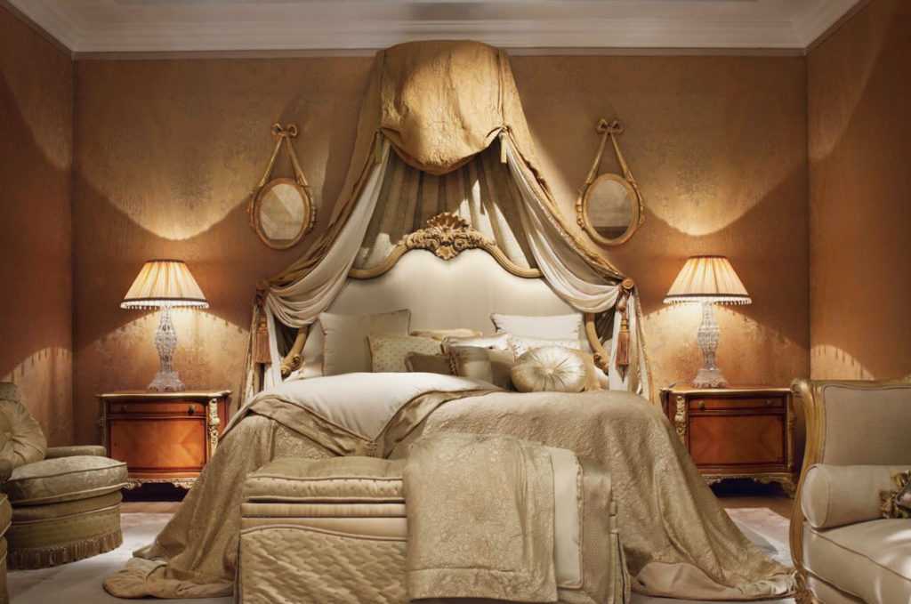 - Спальни, выполненные в классических исторических стилях, такие как барокко, рококо, готика, ампир, романтизм без кровати с балдахином выглядят незаконченными, поскольку она изначально была в них обязательным элементом обстановки.