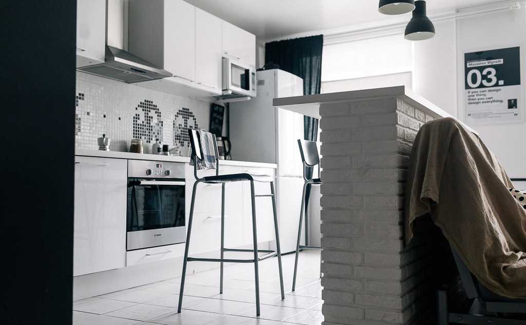 В модерновом интерьере кухни встречаются лаконичные конструкции с необычной замшевой или стильной кожаной обивкой. Добавить необходимого лоска окружающей обстановке позволит модель с обшивкой из ткани с металлическим блеском. Для дизайна подойдут изделия отличающиеся как строгими прямыми, так и выразительными изогнутыми формами.