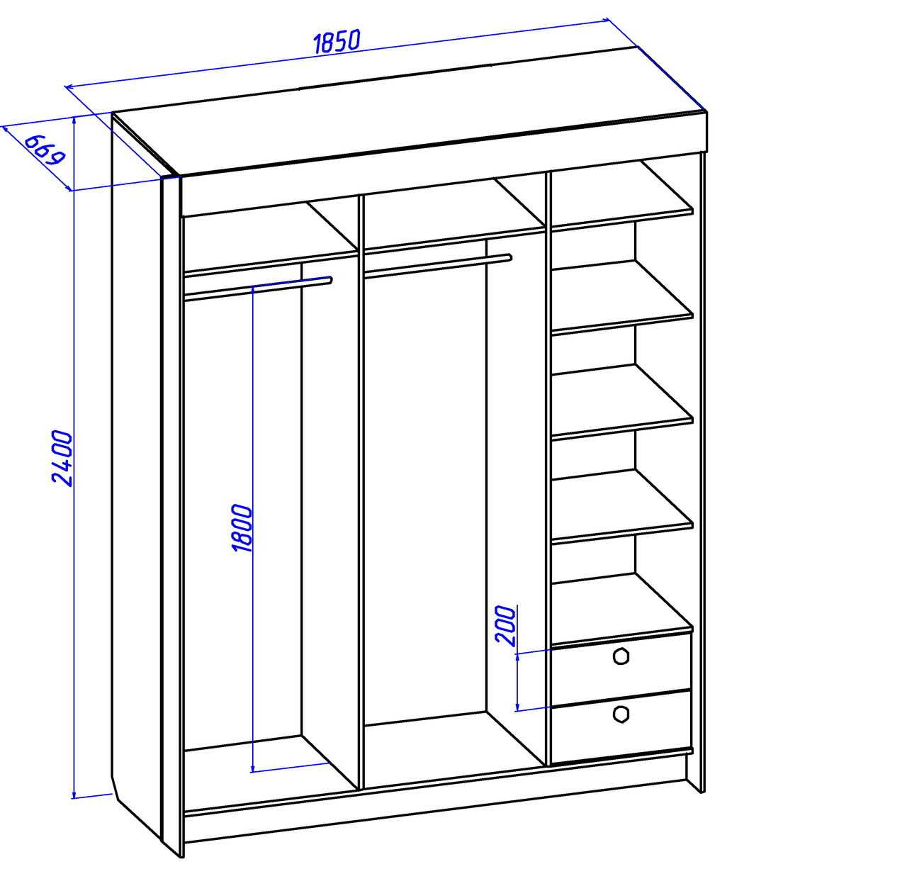 Высота и ширина шкафа выбираются строго индивидуально, с учетом архитектурных особенностей комнаты. Стандартная глубина составляет 600 мм. Такой размер обусловлен, прежде всего, технической необходимостью и удобством использования. 450 мм – ширина вешалок, 80 мм – направляющие дверей, 20 мм – зазор между полками и дверью, оставшиеся 50 мм необходимы, чтобы одежда висела свободно, не соприкасаясь с задней стенкой шкафа.