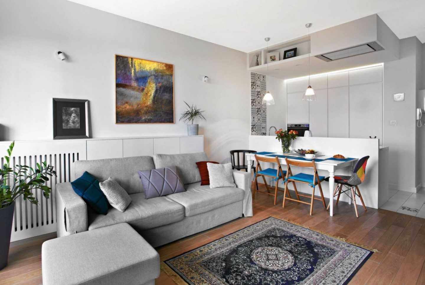 Напротив обеденной зоны. У этого решения много плюсов: дополнительное спальное место, просто приятный отдых, хранение ненужных вещей. Наконец, если нагрянули гости, а обеденный столик очень мал для размещения всех персон, всегда можно подключить диван для решения этой задачи.