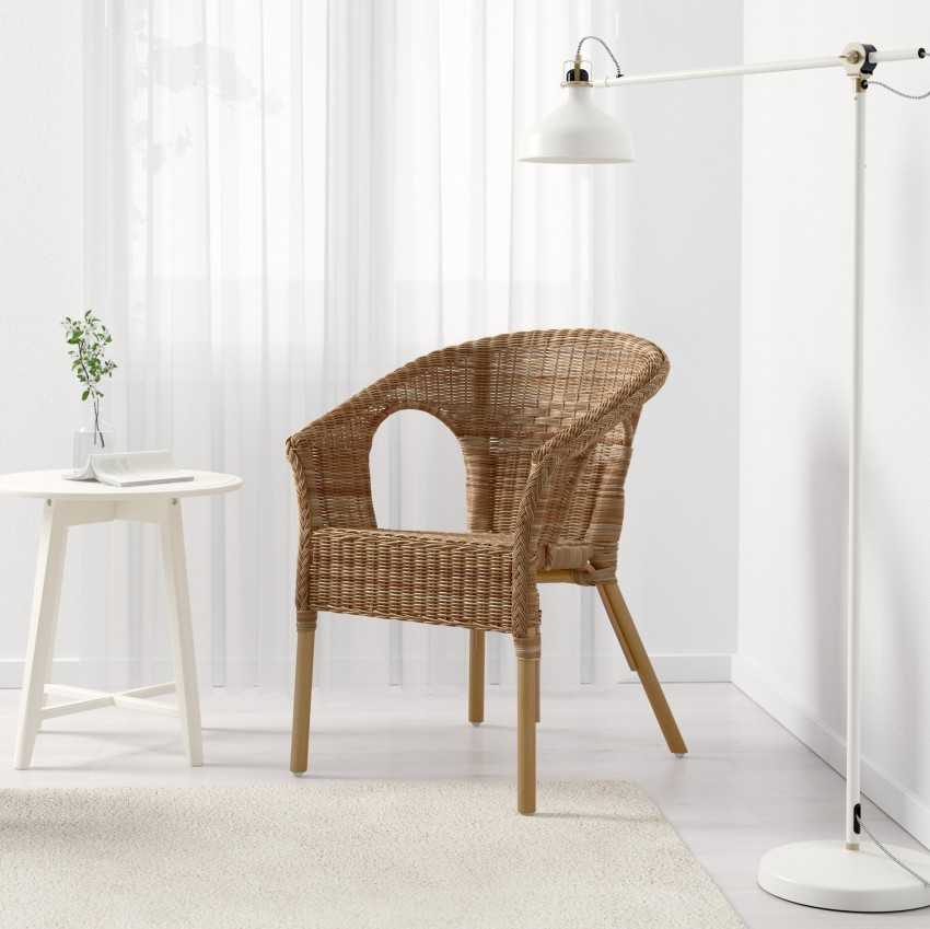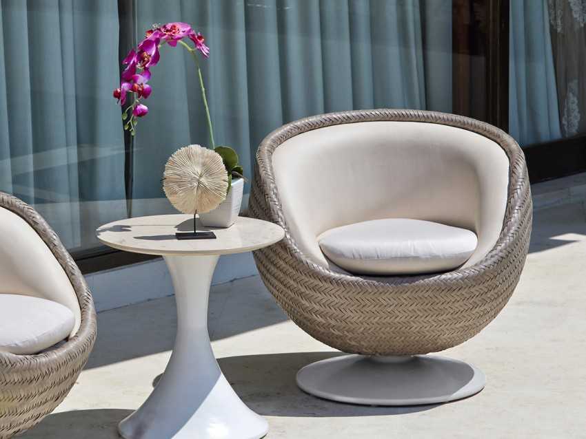 Плетеное кресло из ротанга может быть изготовлено из натурального или искусственного материала.