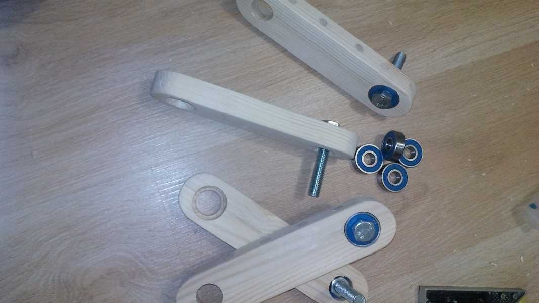 Маятниковый механизм состоит из двух брусков, соединенных между собой при помощи шарниров. Составляющие сажаются на клей или вставляются в специальные пазы. Сиденье делается на основе каркаса, повторяющего форму спинки, из брусьев, скрепленных поперечными рейками. Для сборки маятника кресла-качалки и опоры к ножкам крепятся шарниры, зафиксированные на неподвижной основе – от длины этих элементов зависит угол раскачивания.