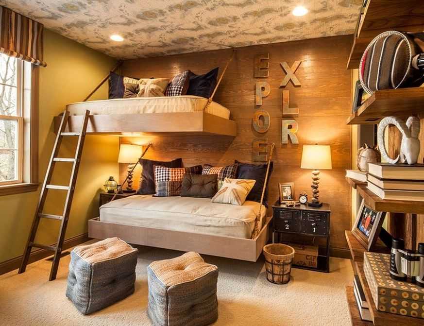 Такое спальное место вообще не оборудовано никакими опорами, но в отличие от предыдущего варианта, впечатление парящего не производит. Все потому, что элементы, удерживающие его над полом, хорошо видны. Это внушительного вида веревки или цепи, закрепленные в потолке или какой-либо другой несущей конструкции.