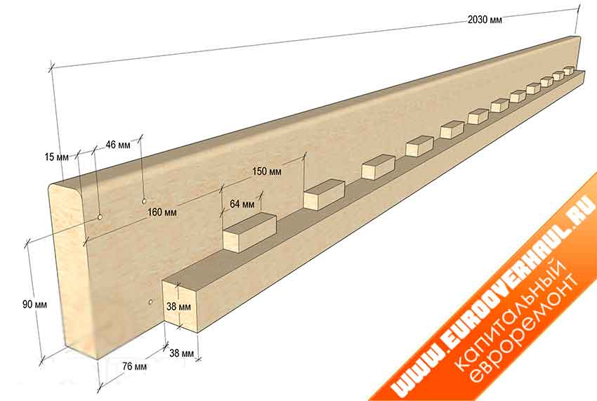 Боковые стенки необходимо выпилить из доски сечением 50×200 мм, фаски снять с помощью ручного струга, приклеить к опорному бруску небольшие деревянные блоки, которые не позволят смещаться элементам речного дна. К внутренней части боковой изделия кровати приклеить опорный брусок.