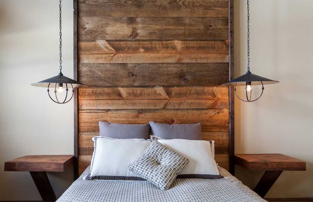 - Из деревянной доски. Если спальное место выполнено в виде подиума, уместен элемент из досок. Сохранив натуральную фактуру, можно подчеркнуть близость интерьера к природе. Поверхность, покрытая лаком, приобретет аккуратный вид.