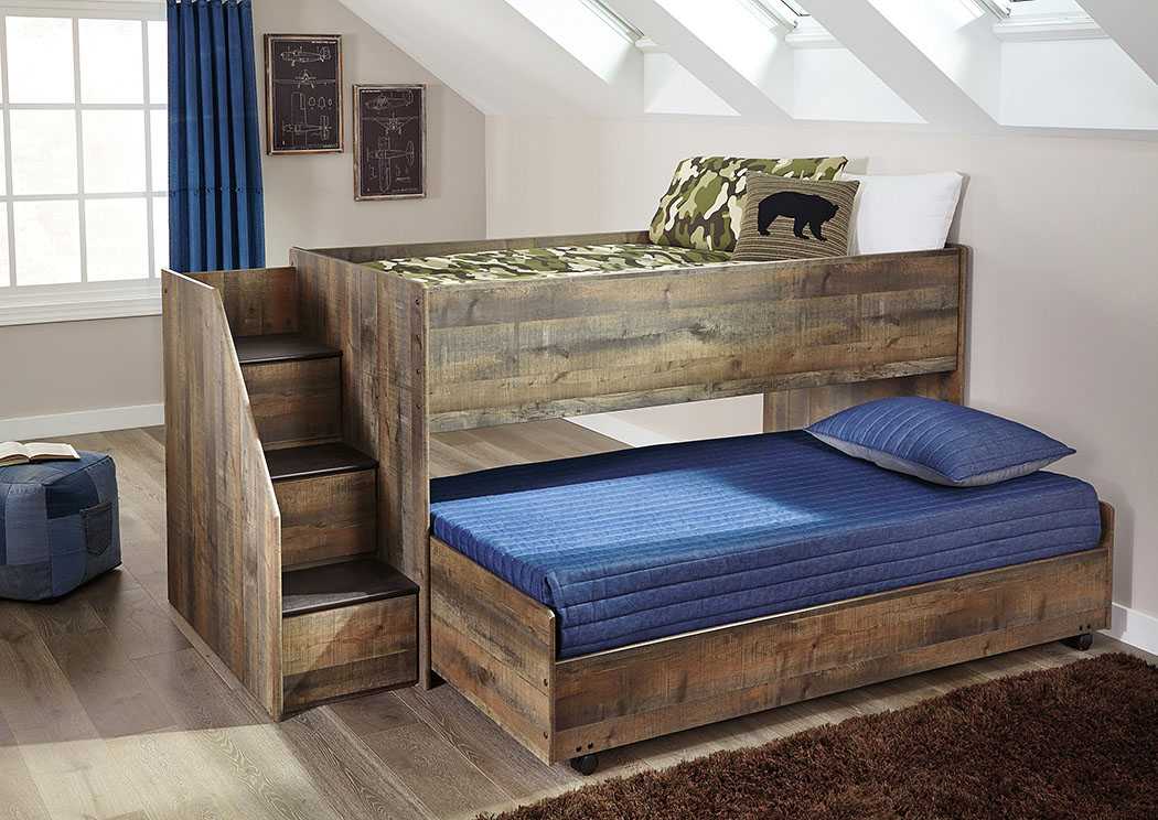 - Двухъярусные — подходят для обустройства детской. На нижнем «этаже» помещают систему хранения либо рабочий уголок. Малышам подойдут деревянные сооружения, подросткам — металлические.