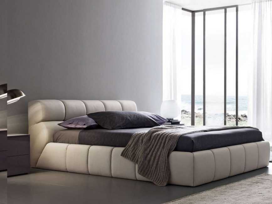 Минимализм и Хай-тек предполагают сдержанность и строгость форм. Наряду с кроватями без спинки, в современных интерьерах часто используют модели с мягким кожаным изголовьем.