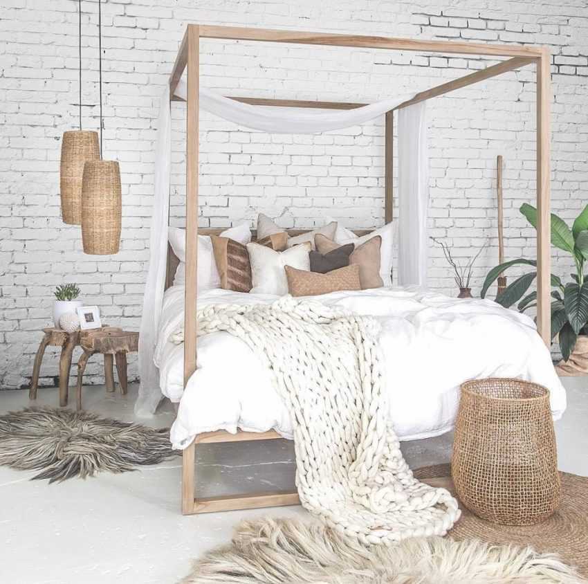 Саму кровать принято застилать однотонной тканью цвета металлик, если такой присутствует в отделке или мебели. Шотландский плед или мягкая выделанная шкура животного украсит ложе с деревянным каркасом.