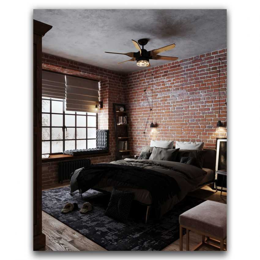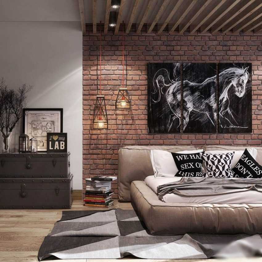 Для спальни отлично подойдут светлые оттенки и бежевый цвет, но вот стену у изголовья кровати лучше сделать акцентной и оформить ее кирпичной кладкой. Не помешает добавить в оформление несколько видов осветительных приборов и даже зеркало, если нужно визуально увеличить пространство. В остальном по меблировке приветствуется минимализм и наличие только нужных вещей.
