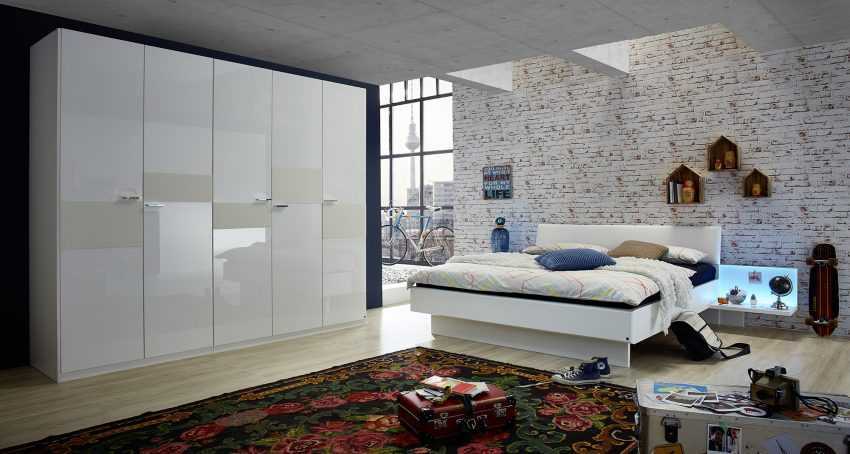 Расстановка элементов меблировки может быть самой разнообразной, но при этом она будет зависеть от особенностей планировки самого помещения. Например, кровать может располагаться в центре комнаты, кроме того ее можно установить у акцентной стены, возле ниши либо отгородить тумбой. В идеале кровать не должна находиться слишком далеко от окон и быть отвернутой от них. Вдоль стены кровать обычно не ставят, поскольку так ее изголовье хуже просматривается.