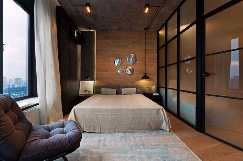 Кровать в спальне лофт необходимо ставить на видное место. Единственное, что здесь допускается, это небольшая перегородка, роль которой в большинстве случаев отводится небольшому стеллажу либо и вовсе ширме складного типа. Если же метраж конкретной комнаты позволяет, лучше задействовать для зонирования внутреннее окно, что будет смотреться весьма эффектно. Когда необходимо уединение, стоит прибегнуть к фальшстене либо использовать для разделения пространства спальни шкаф.