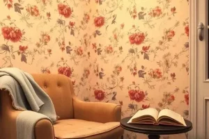 Верхняя часть стены оклеена обоями с цветочным принтом, а нижняя отделана деревянными панелями, окрашенными в светлый цвет