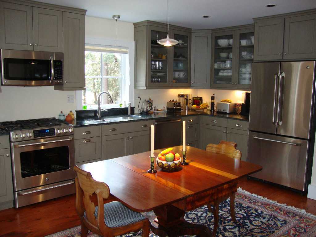 Для большой кухни можно выбрать практически любой вариант обеденного стола, ведь вы ничем не стеснены. В просторной кухне отлично будет смотреться вместительный стол – маленький просто потеряется, и будет выглядеть неуместно. Лучше всего поставить стол в центре, но если кухня оборудована островом, то стол можно разместить и ближе к стене.