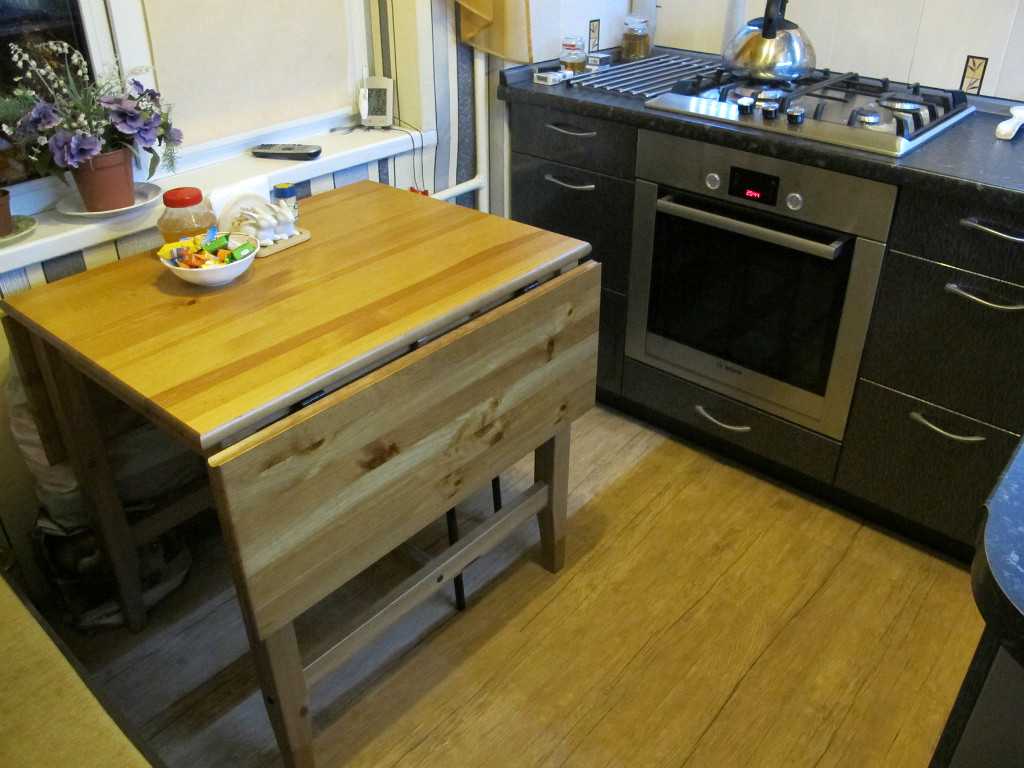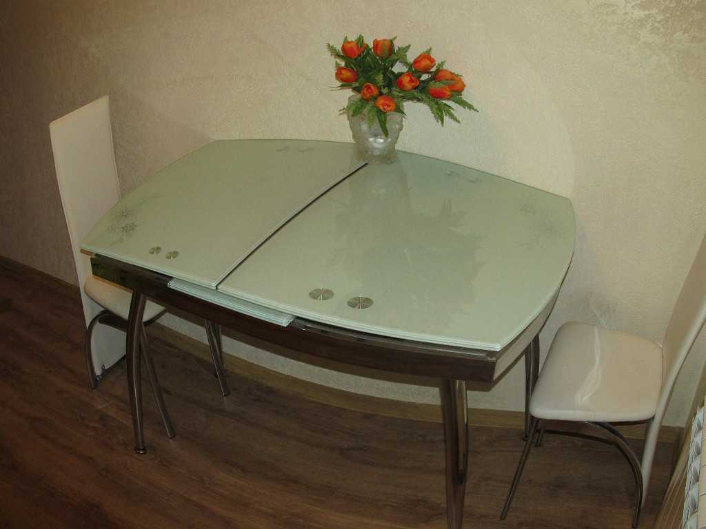 - Конструкцию. Тут нужно делать выбор между обычным и раскладным вариантом. Кухонный стол для маленькой кухни, имеющий возможность расширяться, – идеальный вариант.