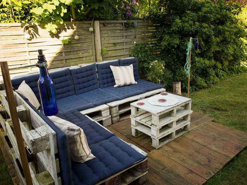 Поддоны еще называют паллетами. Они представляют собой лотки достаточно больших размеров, которые обычно остаются от строительных материалов. Если у вас нет средств на покупку садовой мебели и даже заготовок для ее самостоятельного изготовления, то предлагаем вам использовать для этих целей поддоны. Приобрести их по весьма доступной цене можно в строительных магазинах. Там этого добра хватает.
