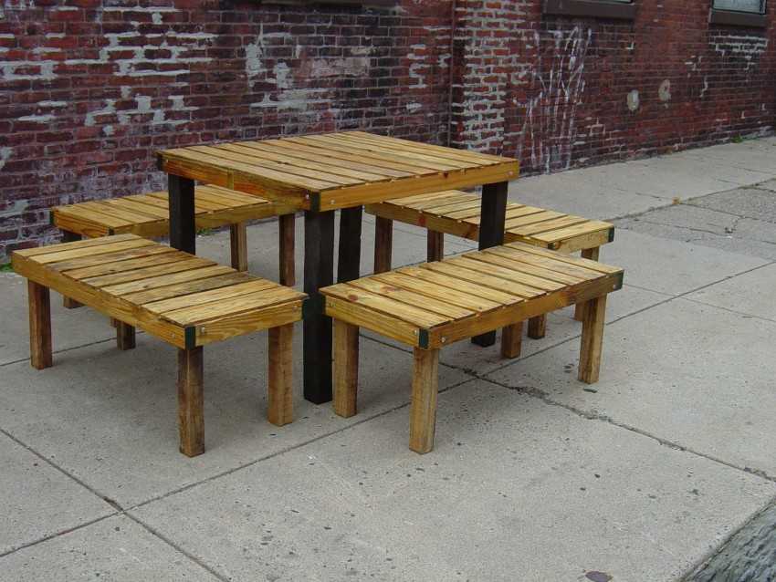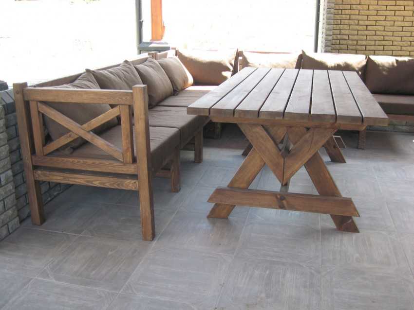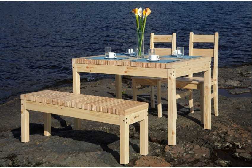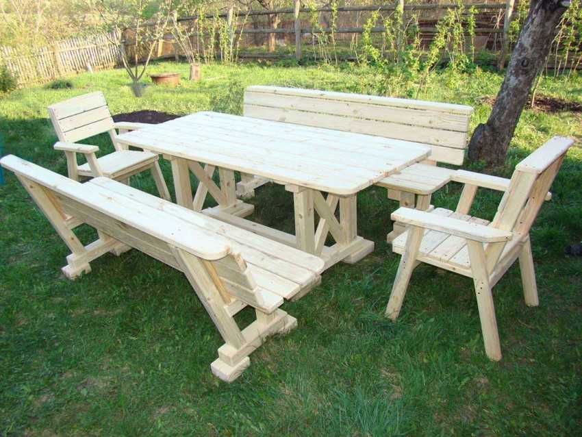Проще работать с готовыми, предварительно обработанными рейками, брусками и досками. Существуют как простые, так и сложные схемы изготовления мебели из древесины. Для организации зоны отдыха лучше сделать скамейки с удобными спинками, для застолья понадобится целый гарнитур. Из скамьи без ножек очень просто сделать качели. Для реализации этих задумок вам нужно подключить фантазию, обладать элементарными плотницкими навыками и приобрести необходимый исходный материал.