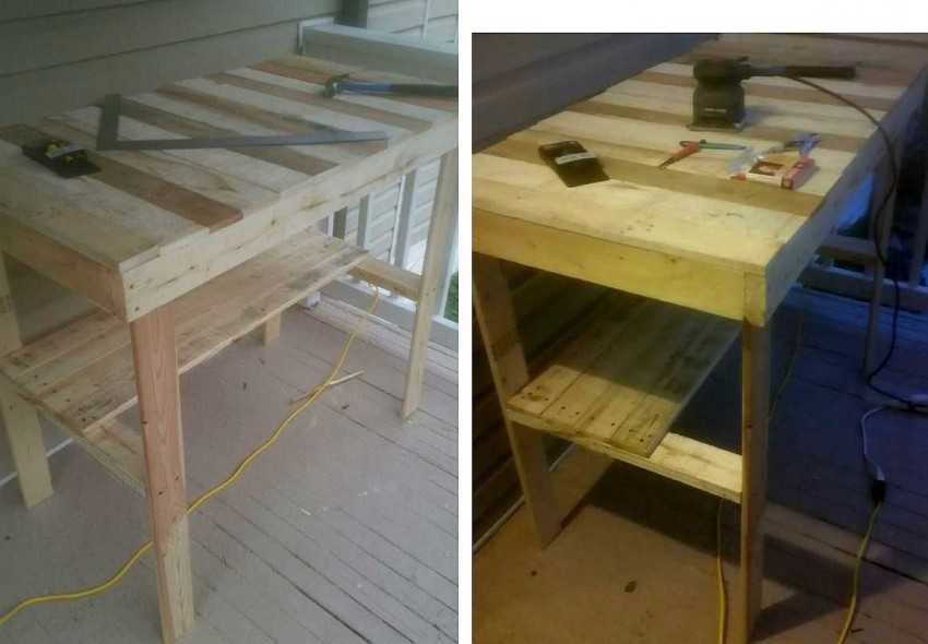Можно разобрать старые палеты, ящики, из которых сделать планки для крепления элементов столешницы, или даже использовать их в качестве столешницы, если доски толще 15-20 мм. Говорить о более тонкой столешнице по меньшей мере несерьезно.