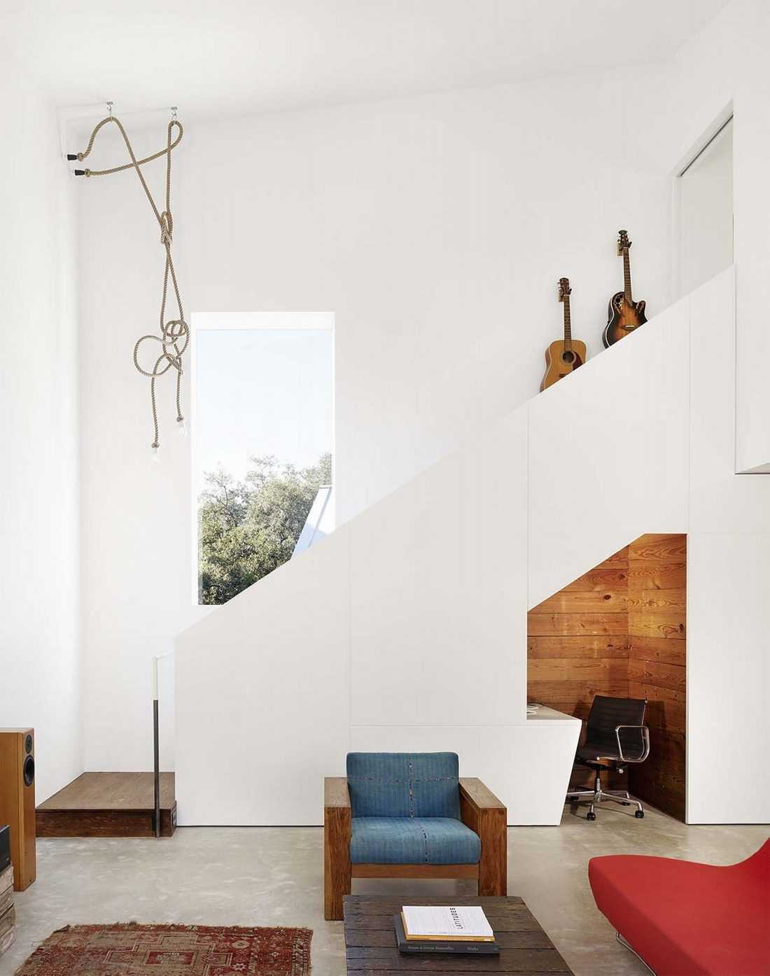 Любой минималистичный дом обеспечивает полную свободу. Внутри него легко передвигаться, ничто не давит, не напрягает глаз. Мебель простая, но изящная, фасады ровные без намека на декоративные детали. Для обивки мягкой группы применяется плотная однородная ткань, цвет которой повторяет цвет стен. Благодаря этому она зрительно растворяется и становится практически невидимой. Предпочтение отдается корпусным предметам интерьера, часто они изготавливаются на заказ под определенный проект дома, поэтому идеально вписываются в жилое пространство.