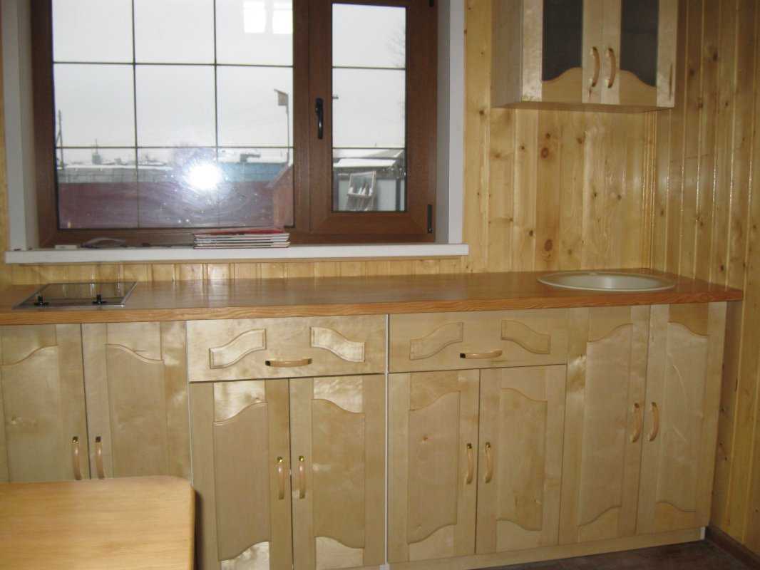 Отдельные модули и полные комплекты кухонного гарнитура. Фасады иногда отделывают шпоном для придания более привлекательного вида. Массив особенно хорош для классических вариантов дизайна, но в принципе подходит для реализации различных направлений