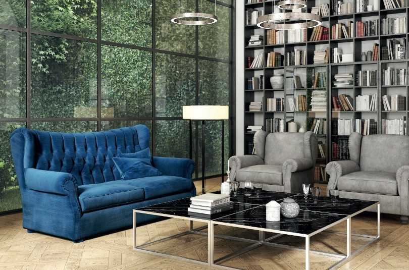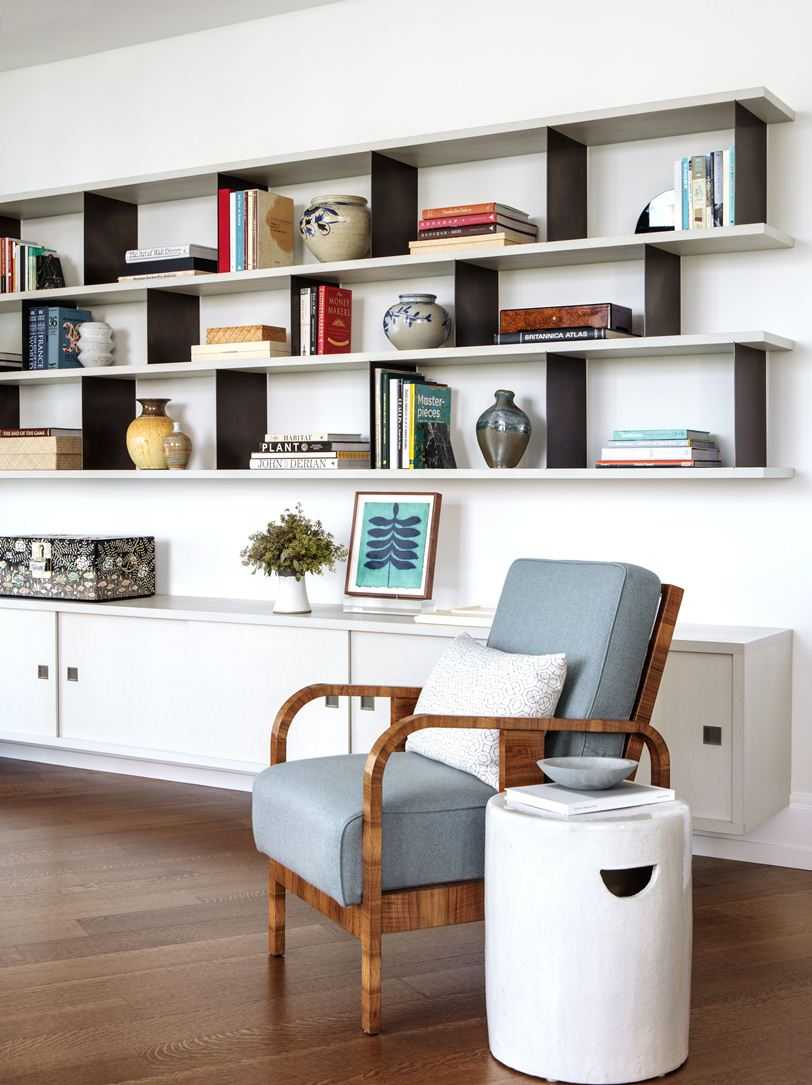 За диванами и креслами устанавливаются узкие полки для книг, которые можно точечно дополнить источниками света.