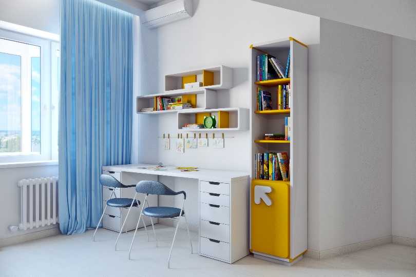 Для детей школьного возраста конструкцию для хранения можно расположить рядом с рабочим местом, где будут отдельные ячейки для канцелярии и другой мелочи.