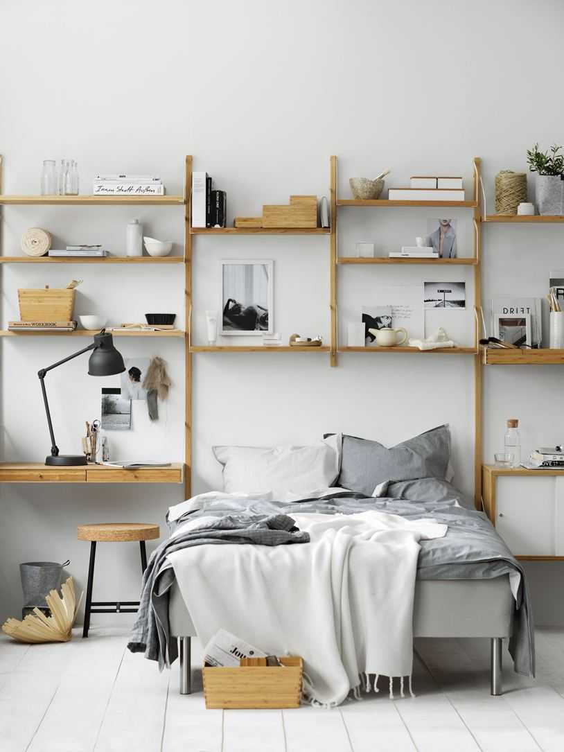 В спальне часто размещают стеллажи у изголовья кровати, такая конструкция обычно п-образной формы. Данное решение позволяет рационально использовать пространство.