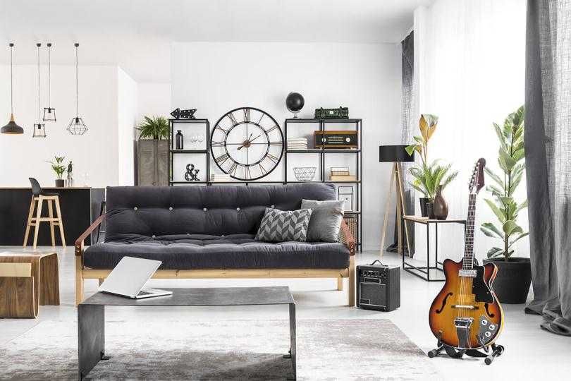 Это комната общего пользования, где обычно располагается наиболее функциональная, вместительная и объемная мебель, но ее можно заменить на легкий и воздушный стеллаж.