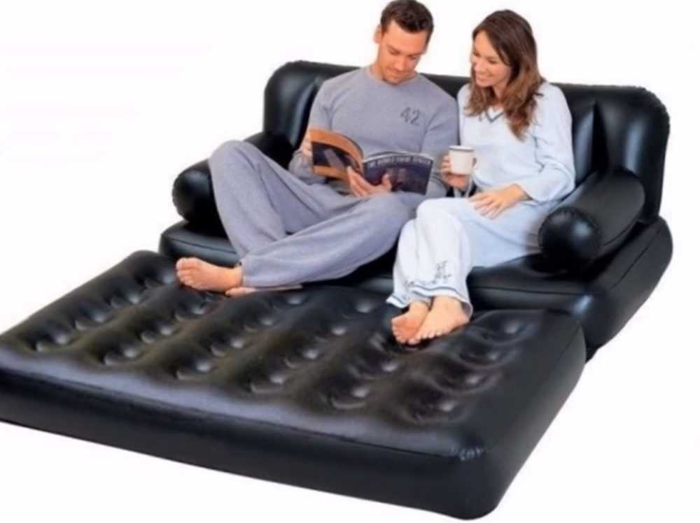 - Выбор по использованию. Если площадь помещения или садового участка достаточно большая, лучше приобрести надувную мебель прямого назначения: кровать, диван, кресло, гамак, пуф. Маленькая площадь удачно вместит многофункциональную модель, легко трансформируемую в нужную форму. Максимальное количество функций достигает пяти. Особенно удобны к использованию кресла-кровати, диваны-кровати. Они дают возможность расположить большое количество гостей, а затем служат дополнительными спальными местами. В зарубежных кафетериях, офисных кабинетах надувные кресла заменяют стационарную мебель.