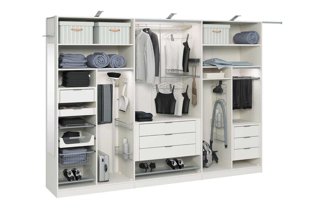 Глубина закрытого шкафа вместе с системой — около 60-65 см — это на тот случай, если секции будут расположены в одну линию. Если же у вас есть возможность расположить полки буквой П или Г и создать подобие гардеробной комнаты, здесь можете рассчитывать глубину по 55 см с каждой из сторон (так как закрывающиеся створки у нас будут только непосредственно при «входе» в зону шкафа).