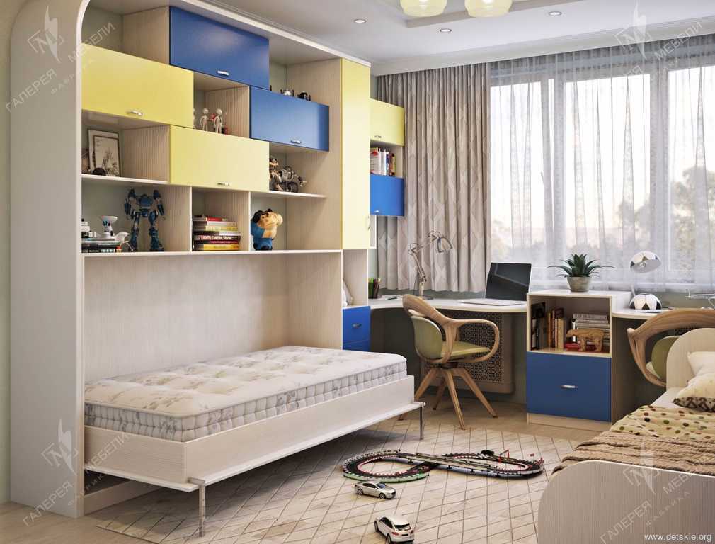Шкаф-кровать или диван с выдвижным спальным местом в комнате для девочки и мальчика до 7-9 лет решит проблему нехватки квадратных метров.