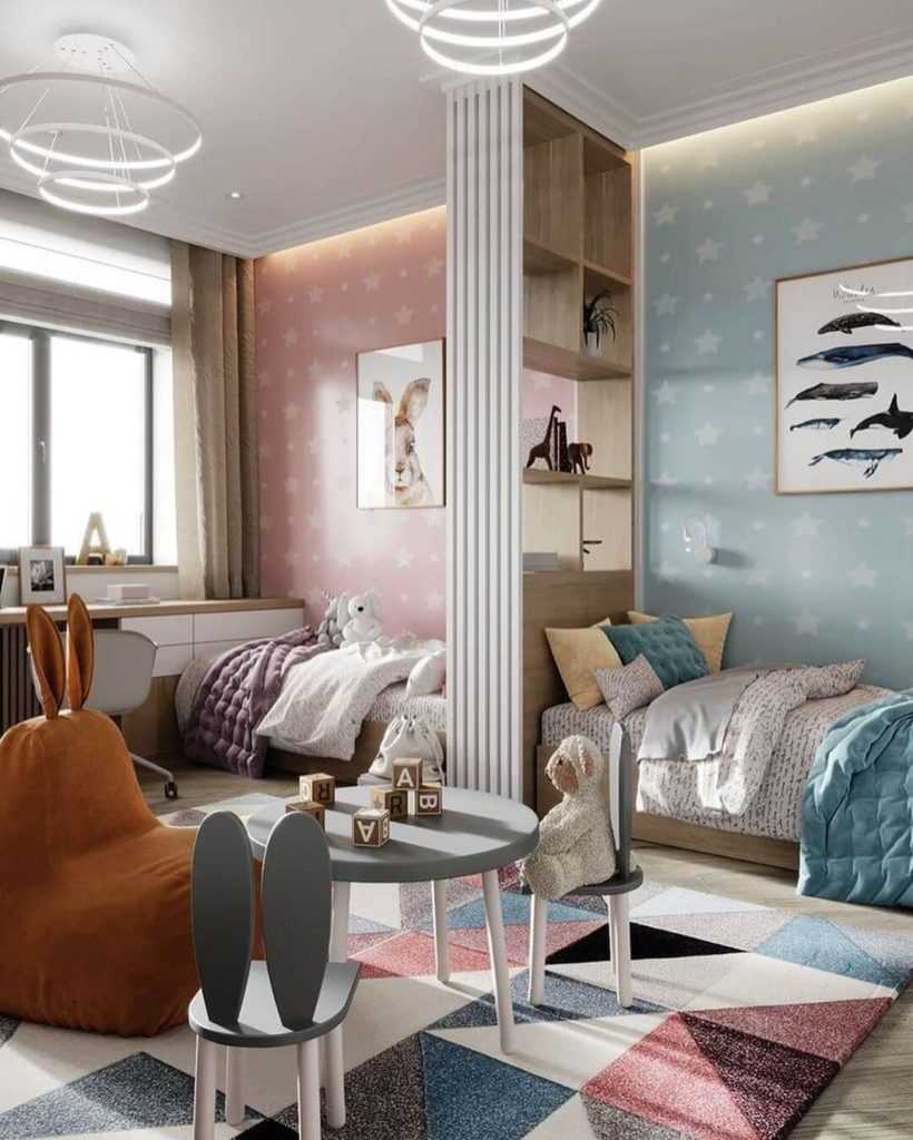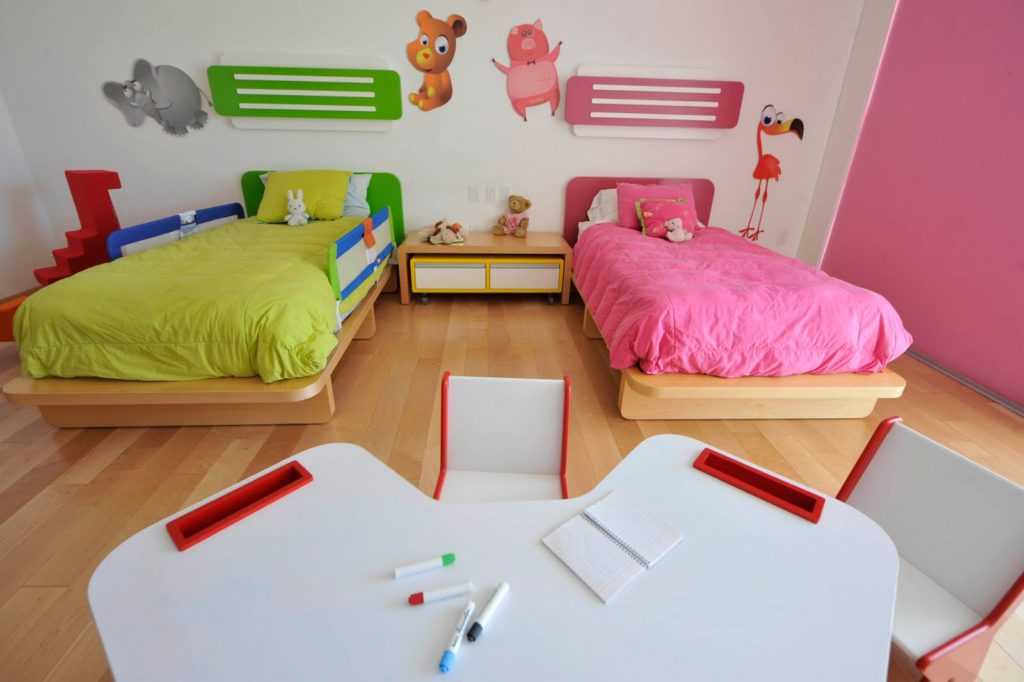 В тесном помещении не получится сделать перегородку, поэтому сочетание традиционного розового для девочек и синего, голубого для мальчиков – не самая лучшая идея. В комнате большей площади она может найти отражение даже без реального разделения (например, окрашивание в эти цвета противоположных стен), но тогда должна быть подкреплена определенной мебель – две отдельные односпальные кровати, две отдельных игровых зоны. В этом же случае оптимальное решение ‑ использование универсальных цветов, подходящих как для мальчиков, так и для девочек.