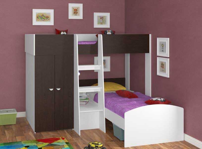Такая модель – хороший вариант для маленькой детской. Особенность конструкции: одна кровать расположена перпендикулярно другой. Спальные места размещаются у стен комнаты, образуя угол. Под верхним ярусом размещают шкафчик, стол, комод. А также обе постели могут быть размещены наверху, а в нижней части уместится просторный шкаф, комод и лестница с нишами.