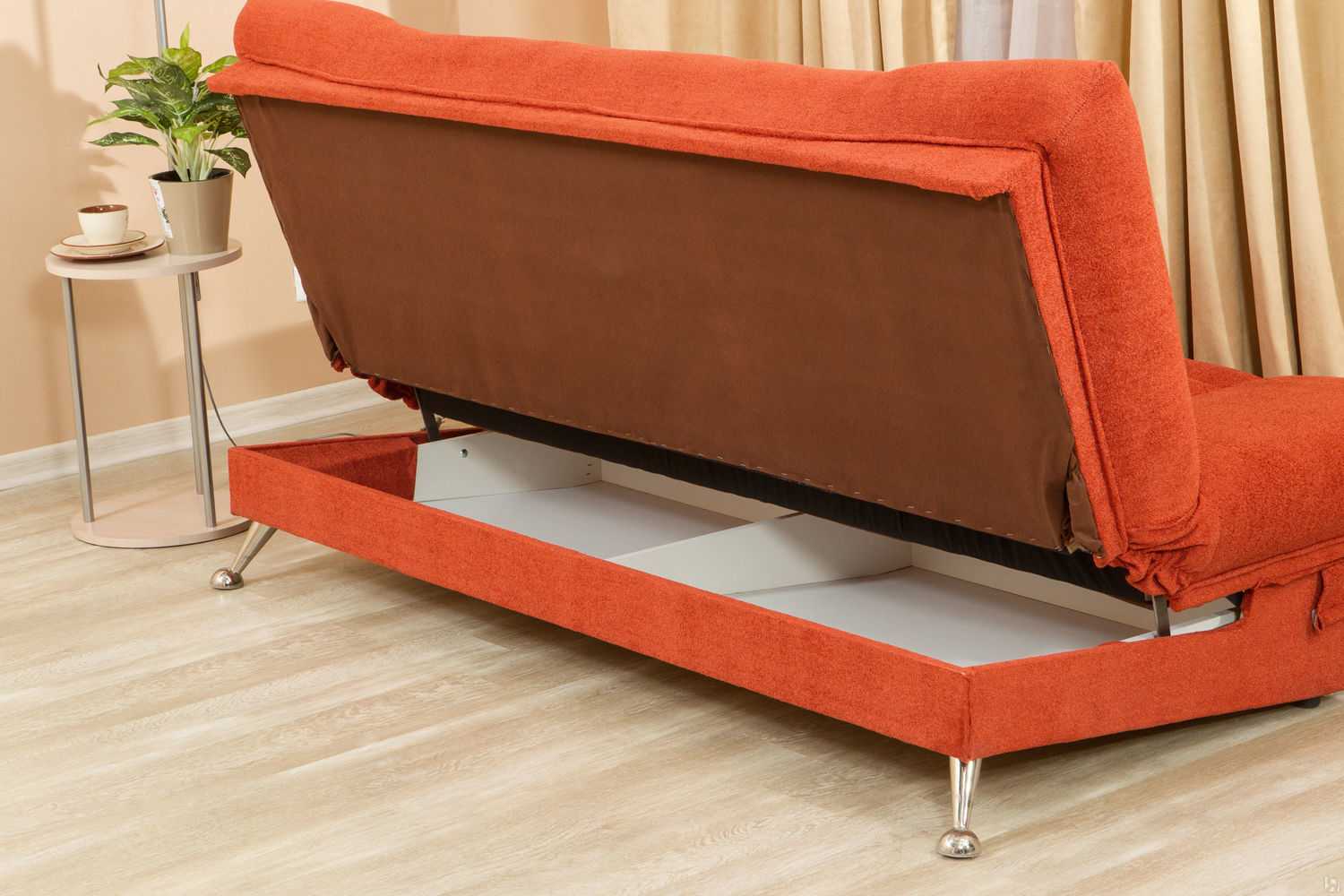 Он привлекает внимание своей простотой и удобством. Процесс складывания такого дивана прост: нужно опустить спинку к сиденью, затем перевернуть их, положив на пол
