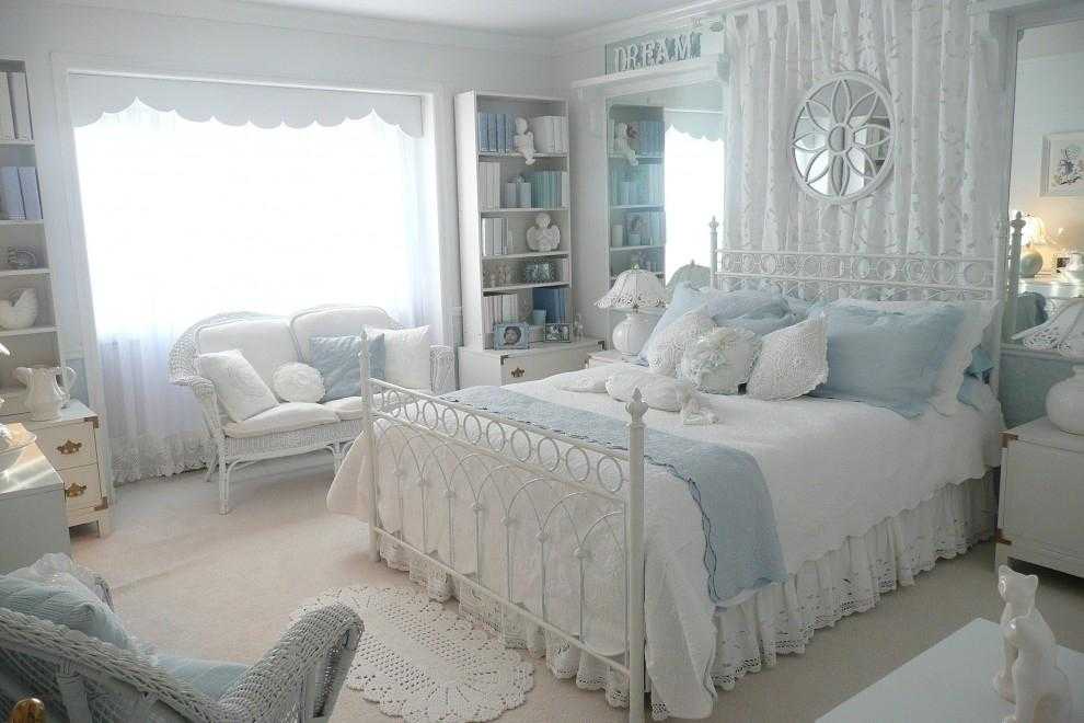 Вдохнуть вдохновение поможет просмотр на сайтах фото оформления опочивальни в прованском стиле. Хорошим ходом станет использование светло-бирюзового оттенка поверхности стен. Он прекрасно гармонирует со снежной поверхностью потолка и песочного цвета мебелью небольших покоев.
