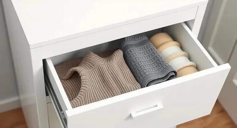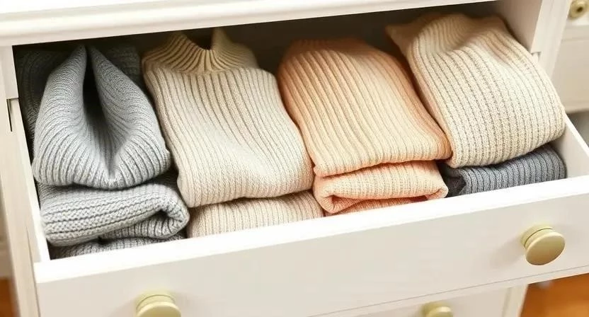 Ответ: Складывайте свитера вертикально, чтобы экономить место и видеть все вещи сразу.