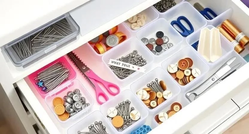 Чтобы максимально эффективно использовать пространство в ящиках, можно использовать различные органайзеры и разделители. Я, например, использую пластиковые контейнеры разных размеров для хранения ниток, иголок, пуговиц и других мелочей.